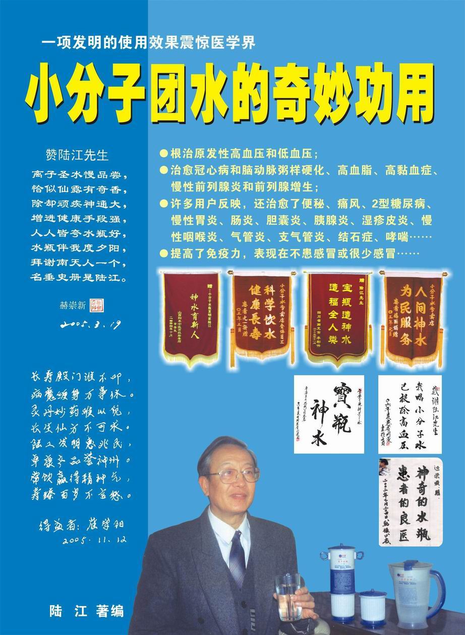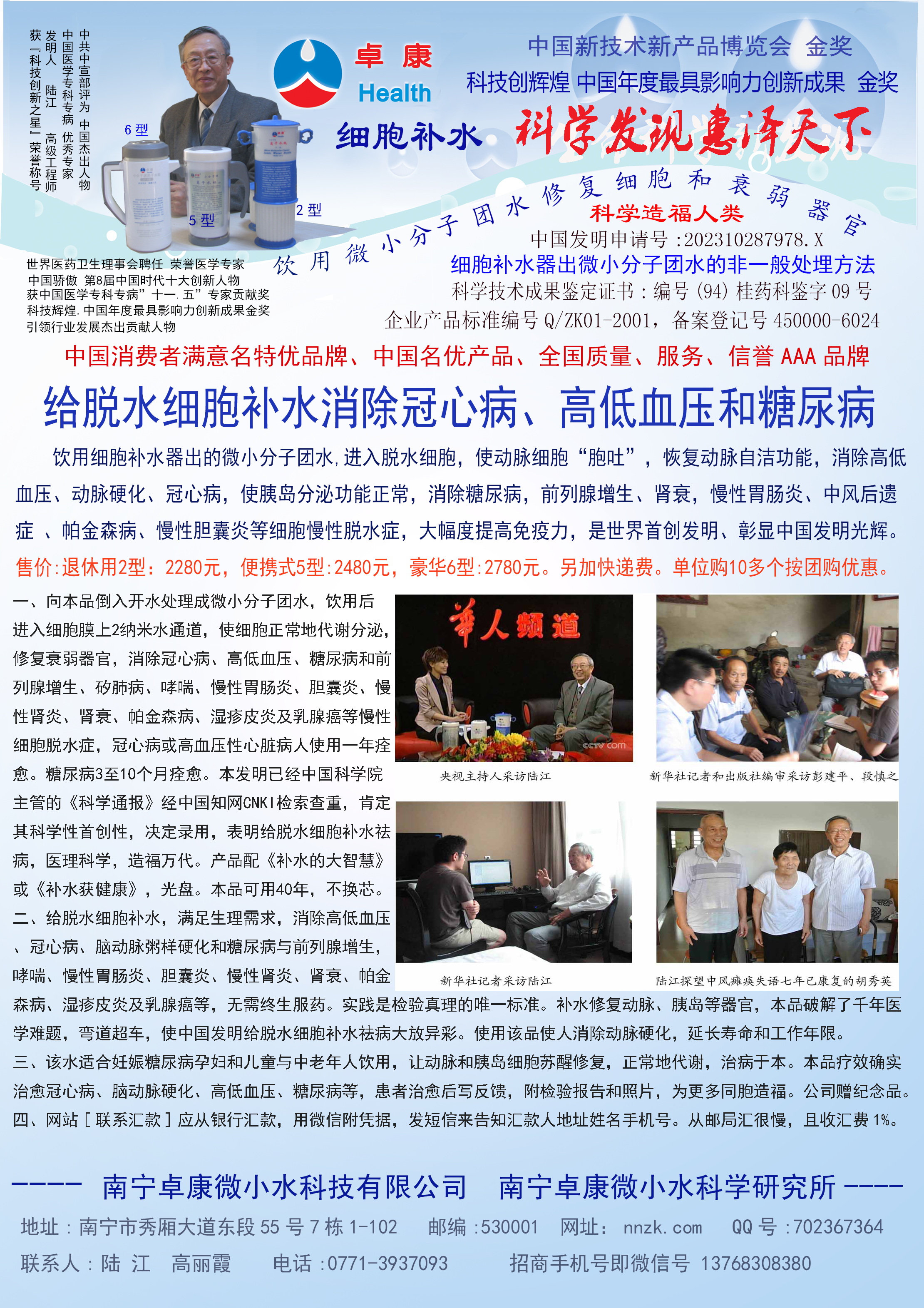 人類幾千年來患以上病癥需終生服藥,幾十年也不能治愈。可是我國南寧的高級工程師陸 江,于1990年想根治高血壓,研究發(fā)明了離子水瓶,處理出微小分子團(tuán)水供飲用,經(jīng)過醫(yī)院臨床試用和專家鑒定,1999年獲中國發(fā)明專利權(quán),產(chǎn)品于2000年投放市場后一直跟蹤調(diào)查,據(jù)全國各地用戶反饋:祛除了高低血壓、糖尿病和冠心病,并使前列腺增生、咽喉炎、鼻竇炎、慢性氣管炎、支氣管炎、矽肺病、哮喘、慢性胃炎、腸炎、慢性膽囊炎、慢性腎炎、腎衰、膀胱炎、便秘、痔瘡、風(fēng)濕性關(guān)節(jié)炎和濕疹皮炎及中風(fēng)后遺癥等病癥不藥而愈。為什么喝微小水能治20多種病?陸 江從1991年德國科學(xué)家發(fā)現(xiàn)細(xì)胞膜水通道僅為2納米獲得啟發(fā),認(rèn)為多種器官患病是因細(xì)胞脫水,不能正常代謝和分裂增殖,才使器官細(xì)胞減少致衰弱萎縮而形成細(xì)胞缺水性病癥。22年來的實踐有力地支持了“細(xì)胞脫水致病”這一重要論點(diǎn),表明喝微小水可滿足細(xì)胞的生理需求,補(bǔ)水就能祛病,是生命科學(xué)新亮點(diǎn)。
